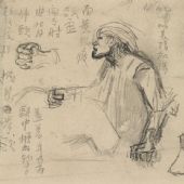 在整体构思和基调逐渐成熟的过程中,局部形象也从构思发展为具体的形象。例如图23(即RM78)是王式廓对被打致残的农民形象的最初构想,该草图图文并茂,细读其中提示性文字,可以看到王式廓对这位农民的年龄、体态、表情、情绪在构思上已比较完整,在日后完成的素描《血衣》中,这位男青年的艺术形象与草图提示性文字完全对应。另如图45(即RM97)是对地主形象进行研究的一张比较完整的素描作品,虽然王式廓最终没有在创作中选取从这一角度刻画地主,但什么是王式廓说的创作性习作,由此可得到解答,即为创作而做的各个角度甚至各个局部的充分而深入的研究。相对于总体创作来讲,它是富有研究色彩的习作,但因其研究之充分深入,其本身也就构成了独幅创作。这也就是为什么王式廓的《血衣》在总体上是一件完整的艺术创作,在局部形象上也是一件一件可以单独欣赏和发表的艺术创作的原因。