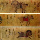 宋代金石学的兴盛以及唐代以来逐渐成熟的拓印技术,使得六骏图像摆脱原初的膜拜场所,从对仪式的依赖中解放出来,以拓片的方式成为一种可以传播和分享的物质文化。原来密不可宣的石刻与文献史籍成为不同民族、不同身份、人人可见可触摸的图像,这种直观的艺术形态在本质上更具启发性和冲击力。苏轼可以获得石本而为之作赋, 赵明诚夫妇可以在闺房私宅中欣赏把玩, 无论宫廷内府、文人书房,或者市场瓦肆,甚至旅行途中,原有的不可接近变成可触摸、可携带、可展卷、可悬挂,既可以是成教化、助人伦的儒家道德规范,也可以在熟悉轻松的环境中愉悦性情。拓片在辗转流传中带来原作无法达到的效果,形成对美的崇拜的最普遍的形式。而这种传播的广度和速度进一步延伸进入不同的艺术领域,拓展了艺术的样式和深度,在传递交流中成为经验智慧的源泉。六骏拓片遂成为一种新的素材进入现实,继续描绘新的社会生活,再度投入创作,再度丰富六骏的意义和内涵,使其意蕴愈来愈丰厚。