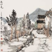 林容生的艺术具有这种主观与客观相互生发的微妙平衡。读他的画,我首先注意到作品中的符号化特征。在他的笔下,田园风景、民居老屋被提炼成为不规则的几何平面,以简约的局部造型和丰富的整体组合达到视觉上的对比,在直线和斜线的理性组织中,不时见到绿树的曲线组合;凝重的山峰块面之上,可以见到精到的轮廓线条与活泼的苔点。从而使这些特定的地域景观,以符号化的方式组织成为视觉化的情感画面,进而由视觉化的画面传达出整体的宁静氛围。清人石涛说过,“用情笔墨之中,放怀笔墨之外”,是说山水画的创作,不仅要得山水情怀,更要抒个人情怀。林容生在山水画中追求的是一种闲和趣远之境,而他以恬静之心来表现深远之意,可以说是深得传统中国绘画的三昧,正如清代恽寿平所说:“意贵乎远,不静不远也”。