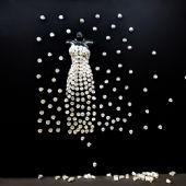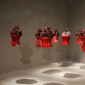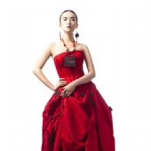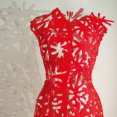 2、吕越有一系列以红色为主基调的时装设计,将中西方文化元素融合一体。其中《女红》系列是持续了近十年的创作积累,主题借用“红”字的两个读音,以东方古老的绸织锦缎等材质,围合具有西方时尚特征的高胸细腰的紧身胸衣,遍插900朵玫瑰,在展览过程中将时间与空间的变化与范畴纳于一体。整体的红色体现了“近者悦,远者来”的生生不息与美善相乐的中国情怀。材质、造型与线条塑造出的多元形态,加强了视觉上的戏剧张力,丰富了视觉语言,而玫瑰花朵的生老荣枯增添了身体、心灵、服饰与外在空间的对话与多维度的生命情感的体验。整件作品是东西方文化意象的运用与阐释,有静态的色彩节奏与动态的人情冷暖,表达了一个时代对美的想象,具有深入人心的穿透力。相关的系列作品还有《吉日佳期》、《中国印》、《生生相合》、《梅花三弄》,都是在红色的映衬中,以俯拾即是的传统符号展示了传统的文化内蕴,以时装艺术的方式呈现了天人合一的思想。