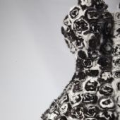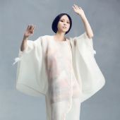近年,吕越的一系列作品表达了对简与减的追求。《节律同构》以同一色系的垂地白锦赋予丰富的肌理变化和多样性,在自然的廓形中穿插交缠出千丝万缕的关联,融合打造极具张力的渐变质感,感受材质的多样性中的节奏感与韵律感。《痕迹》使用富于垂感的半透明的轻罗灰纱,领袖的阔大与样式的夸张彰显出传统与现代的张力,下摆与袖口间不规则的波浪纹近似荷叶的变体,华丽而雅致,以薄厚、挺褶的对比与调和尽显极少主义的风度,利用光的扩散性及在面料上产生的凹凸与明暗感,使面料具有了灵气和生命的和畅。《余香》以一次性纸杯的疏密排列、集散组合,制造出一种升腾、发散、飘移、散落的印象,仿佛历经岁月打磨后氤氲的记忆,“飘红堕白堪惆怅”呈现出吕越对服装实用性以外的多样化的创作形式的思考与实践。