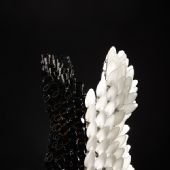 作品《昼夜阴阳》中运用黑色灯口与白色灯泡,仿佛在聆听子曰“逝者如斯夫,不舍昼夜”;《阴阳两谐》和《对合》中正反使用的子母扣与色彩的对比,《五行之木》和《生生相合》中以镂雕手法,利用汉字与图型镂空的原料与成品的穿插与错落,经过独特创意的解构与改造,在材料、造型、工艺和色彩上呈现出经典的榫卯的关系,印证出阴阳和谐的中国哲学观念,在看似矛盾的组合中寻找平衡与和谐,既包含着循环、周期的含义,也暗示着轮回、交替的意味,更是积累、成长、蜕变的传达。让我们想到沈从文的一段话:“自然既极博大,也极残忍,战胜一切,孕育众生。蝼蚁蚍蜉,伟大巨匠,一样在它怀抱中,和光同尘。因新陈代谢,有华屋小丘。智者明白现象,不为困缚,所以能用文字,在一切有生陆续失去意义,本身也因死亡毫无意义时,使生命之光,煜煜照人,如烛如金。”吕越就是要探索和转化中国文化举足轻重的存在意义与手法。
