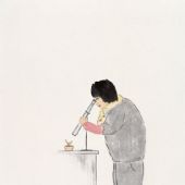 刚才读书老妇人旁边的位置上不知什么时候又坐了一位穿紫色毛衣的妇人,她在写着什么,厚厚的一大本已写了一半的页数。她小小的个子,戴着红色边眼镜,显得平静,她的神情不像在写日记,而是在写其他内容的东西。她的状态有些像中学老师,她写字的右手带着戒指。这时,矮个妇人买糕点回来了,她坐在面朝我的位置,她以前的位子上坐了一个老人。妇人圆圆的脸,黑黑的眉毛和眼睛,嘴有些大,她右手拿起那半杯饮料,捏着翠绿色的吸管的左手的小手指微微翘起,慢慢吸着,眼睛一动不动盯着杯子。