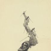 上世纪五十年代,古元试图在艺术形式和格调上进行更多的尝试。像1957年的《竹排》,虽然仍是渔人撑排劳动的情景,但竹排排列的形式感、留白制造的诗意显然吸引了观众的主要注意力,换句话说,这件作品的形式已经大于了内容。《竹排》并不是孤例,在《热情的印度人民》、《绍兴风景》等作品里,多少也能看出古元在形式、色彩上的实验。虽然这些并不能掩盖古元在这一时期创作的大量工农、革命题材的主流作品,但也能够说明他已更多地关注到艺术的形式问题,艺术作品本身的美已变得比以前更加重要。