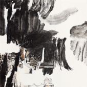 看姚鸣京的画,离不开他的“禅境”,佛寺和佛像也不时出现在他的画中,取代了古人的茅庐和隐士,像符号一样指示着他所追求的境地。事实上,不论今人怎样解释禅境,真正的禅境并不存在。姚鸣京的画是否就是他对禅境的解释和理解,除了符号的暗示外,图式似乎说明了更多的东西。如果说姚鸣京的画有一些现代艺术的成分,那就是反映在他的构图中的几何形切割,以及超现实的荒诞,他不是根据自然来编排黑白灰的关系,而是按照内心的感受来对应外部的世界,客体服从于主观,不论这个主观是潜在的自我还是宗教的意识。一切被颠倒的、分割的、虚无的客体在主观上都是真实的,这种真实性并没有普遍性,因为这是姚鸣京的图式。他在处理他的图式时具备了两个优势,一个是对传统技法的掌握,具有从有法到无法的条件,当然,传统不仅意味着技法,也意味着观念,正是在传统技法与观念的掩护下他才能自由地无法地创造和表达他的形式。另一个就是真实地面对自我,传统既不是对自我的束缚,现实也无法压制自我的表达。姚鸣京画出了他的品格,也创造了他的禅境。