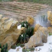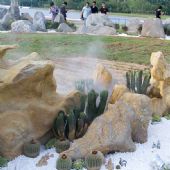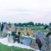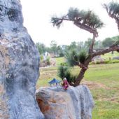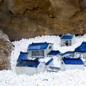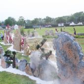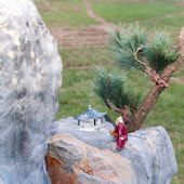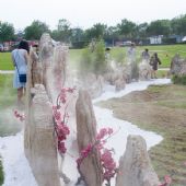 展览作品以陶渊明的“桃花源”为创作原型,以中国山石和陶瓷为主要创作媒材,其中山石总重量超过60吨,分为九组,分别来自中国五个不同的地区,并带有当地的人文地理特征,其特色可以对位(或反映)中国古代山水画的典型风格,揭示出中国山水画内在美感的来源。山石皆为扁平形状,艺术家有意营造一种介于绘画与现实之间的“二维半”效果,用徐冰自己的话来说,是用一种不太标准的、怪诞的当代艺术形式探讨具有中国文化内核的表达方式,并在其中寄寓自己的一种理想,制作一个乌托邦,使自己想象进入一个理想的境地。山石之间的屋舍、亭榭、高士、动物等均在景德镇以陶瓷烧制,在雾、灯光映衬之下呈现一带有理想主义色彩的景观,创造出文人意趣,也增添梦幻的游玩之趣,引起观众对美好生活的共鸣。作品在英国展出时,作品中央是一滩池水,这也是徐冰创作这件作品的动因之一,而此次在北京奥林匹克水上公园展出池水无法实现,艺术家遂将池水转换处理成良田,不同的环境给作品带来不同的感受,中国传统文化是建立在农业自然经济之上的,如此也更符合中国的文化情境。