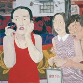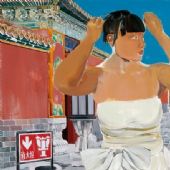 他以一张坤宁宫内景的彩色照片为素材,重新构建了这个象征着封建最高统治者天地交合的场所。他保留了照片的一些场景,这些场景预示着生命的延续与性的隐喻——慈禧题写“日升月恒”的匾额以及贴有“囍”字的宫灯,但他又用灰冷色调的地砖和屋顶压抑了这种氛围。两位青年女游客和斜挎着“为人民服务”字样帆布军包的男子在这里不期而遇,男子将双手伸出暗示着一种试图交流的意愿或者是欲望的冲动,却欲言又止。男女之间存在着一道很难逾越的界线,就像在两者之间的位置出现了一个“参观止步”的指示牌,似乎在告诉画中人,也是在告诉观众,这只是一个观看的空间。可能与那个年代其它直透人心的故事相比,马晓腾制造的“观看”是一种隐喻式的叙述,作品并不会真正的告诉观者故事是如何发生的,而是说这里确实可能存在过什么。