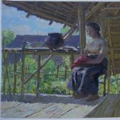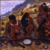 第二天,即壬子(鼠)年考节第一天,我一大早起来,去军事展览馆看小孙和张建忠,姚钟华正在创作的画。张建中画《苦聪人的第一代大学生》和《探亲》,姚钟华画《北京的声音》,小孙画的是《阿细新歌》。三位青年画家的新作都给我留下了题材新、角度新、有鲜明的边疆民族特色和浓郁的时代生活气息的良好印象,姚钟华的画表现雪上峡谷中藏族同胞扭开新买的半导体收音机刚刚听到北京的声音时的那一刹那喜悦的心情,很有诗意;小孙的《阿细新歌》则描绘了九个阿细姑娘在田间插秧的动人情景,背后是水库、青山、蓝天、白云,九个姑娘以不同的姿态在水田里站成一排,有的正埋头插秧,有的手持秧把正准备插,有的戴着草帽,有的包着头巾,中间的似乎与画外另一地田里的姐妹们在对唱山歌,灿烂的笑容,欢乐的歌声,清新明丽的色彩,生动鲜活的画面,使人有眼睛一亮的感觉。平常的劳动场景,朴素的生活感受,却表现得新颖别致,很不平常。这幅油画,入选当年的全国美展,受到好评,成为孙景波的成名作。