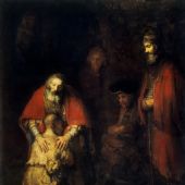 人们不觉然地感到了:那光和影,也许竟是伦勃朗慈悲的目光,如他宽厚仁慈的心怀,如轻轻叹息的声音,深情慈爱的抚摸;如含有暗示和象征,如隐秘中生命的悸动。也许这就是他艺术中最令人感到诧异的魅力所在了。《浪子归来》是他生命之旅将近终点的作品。为构思这件作品,他曾画过不少变体画,作过不少素描和铜版画,他倾注的心力使这件作品产生了罕有的催人泪下的感染力。《浪子归来》既是他自己一生艺术追求的一次终结性表现,也是他对自现实生活之旅接近终点时,百感交织的大彻大悟的表现。也许,他曾回想过早年他创作的《在酒店中的浪子》……到头来,他历尽沧桑,归依在慈父的漆下——那是他自己心中基督的化身。