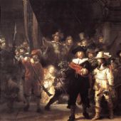 1642年,当三十七岁的伦勃朗,把他为阿姆斯丹射手协会一幅巨幅油画群像交付给他顾主们的时候,他的艺术理想终于和当时的社会的认识之间发生了不可调解冲突。他不肯像同代人哈尔斯那样——把类似这样的一些尊贵的武士们,都平铺罗列地、按着每个人希望的姿势,排列在一种毫无生活联系的构图之中;也不肯像梵代克那样,把一个个孤立的人物,及其毫不相关的虚假的动作组织在一种耀武扬威的夸饰气氛之中。尽管哈尔斯和梵代克同类题材中的成功在当时已经被看成典范之作。天真的伦勃朗甚至不肯重复自己在《解剖课》中被证明是成功的经验,他仅仅让自己去听从这个题材在他心中唤起的艺术感觉,一种从现实生活中看到的历史精神,一种企图借助角色导演一幕当代人生活剧目构思的艺术激情,去表现人们生动的、血肉般的生命联系——那是一群快乐的射手们刚刚走出它们的官邸,还没有集合起来的人们正在检查枪支,正在展开旗帜,调试鼓号;街上看热闹的孩子们也穿插窜跳在队伍中间,栩栩如生的众多人物在运动中形成自然而然的组合,形成聚散和疏密、节奏变化的丰富的对比。他用大片的灰棕绿的色调,隐约地画了射手公会的建筑背景,把一些用于渲染气氛的无关紧要的人物概略在一片看似简捷又变幻莫测的暗影之中;而前景他运用不同笔法和肌理的效果,描绘出各种衣料,装饰物和武器物件的质感。极尽能事地显示出油画语言“魔幻般的表现魅力。同时,他又运用光影,明暗和黑白对比手法,使画面产生了交响乐般的节奏,音色响亮的主体人物,与随从人物之间出现了令人惊异的层次和空间变化。就技法而论,这幅射手工会的群像标志了伦勃朗绘画艺术的登峰造极!可以说,此前在荷兰及欧洲还从来没有这样令人出其不意的群像构思。从来不曾有过这样令人激动不已的场景描绘。这就是被后世人们赞誉为欧洲美术史上最伟大的作品之一《夜巡》。看得出伦勃朗对笔下的人群投注了他由衷的敬意和亲切之感,因此,他绝不会料到:正是他这一番苦心的艺术经营,招来了这批“画中人”的抱怨和愤怒——他们说,他们都出了同样的钱,必须应是每一个人在画面中都处在同样显明的地位上。伦勃朗绝料不到,这幅画竟使他和射手们之间陷入了一场结果于退赔订金的败诉。他的职业名誉因此而受到了严重损害。随之世态炎凉的突变使一批买主和顾客纷纷撕毁契约相继离去。上一年他的母亲去世,随后,三个孩子也前后夭折。更悲惨的是,在创作《夜巡》的同一年,他的爱妻莎士基亚也不幸病逝——雪上加霜——祸不单行!他的生活处境和艺术生涯从此发生了急剧地转折。