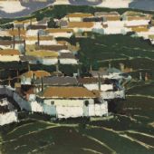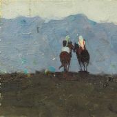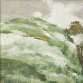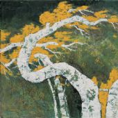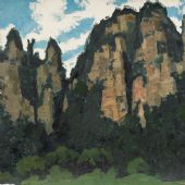 闻先生的佳作甚多,尤以象征性的革命历史画和纪念碑式的大型风景画为主。这些画作无不与先生的品性相合。画中没有世俗的沾染,正如他在画作《子夜》中荷花所显出的出污泥而不染的高贵品格。也许是坎坷丰富的人生经历,历尽了人生的荆棘与繁华,便转向了生命的纯粹,不用华丽的色彩和笔触,而以浓烈稚拙的笔痕,有深意、有情感的色彩造境取势,这色彩不是眼见的真实之色,而是精神性的表征,在纯净鲜明的色彩上闪烁着高品质的生命光辉,灿烂在心上,显现在画布上。用几种颜色的配搭便画出了生命之苍凉、孤寂,天地之壮美。他的画作也不是对事物的完全描摹、叙述,照搬客体,而是以个人的纯正情怀,对生命的感悟和象征意义,进行着理性的精神书写。画中的山林粗粝中有水墨般的层层尽染,不是古人闲情逸致所寄情的山林,它们立于磅礴的天地之间,具有纪念碑式的象征意味,表现出先生刚健正大的精神内涵。人若于其上显得多余,显得渺小。画面笔色叠压之厚重,显出先生生命历程之厚度,思考之深度,探究艺术语言之力度,学养之深厚。
