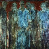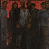 这幅曾被简称为《英特纳雄耐尔一定要实现》的画,是我在油画研究班的毕业创作,也是我的油画大型创作处女作,长期酝酿,在其前身水墨画《血债》的基础上,经罗工柳先生的精心指导完成。当时反映不错,展出后曾在人民日报、美术杂志上发表,又因在对外发行的《万年青》画报发表,曾接到意大利某刊物来信询问发表、展出事宜……
