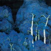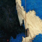 在一些风景画中,闻立鹏通过色彩的组合来抒发自己的感情,早春的欢悦(如《春早》)、秋景的静寂(如《秋之白桦》)……在这些表现大自然片断的作品中,他把对自然景色的“情绪”的表现放在了第一位,我们称之为“表现情绪的风景画”。画家被自然景色中一种浓郁的“情绪”感染了、熏陶了,引起了情感上的强烈共鸣,并把这种感受用富有诗意和音乐美的语言表达出来。在另一些风景画中,闻立鹏的创作离开了对风景的描绘,而是把从自然中所获得的感受融入了自己的想象和思考之中,赋予了画面更深刻的意义,并使绘画语言显示出更独立的价值。《桦林梦幻》《寂》《深谷》《蓝色的记忆》等便属于这一类作品。而他多年来不断在创造的“无字碑”系列的绘画语言更为单纯、凝练。我把闻立鹏这一类作品称为“表现精神的风景画”。在这些画作中,与其说作者是在表现自然界的精神美,毋宁说是在表现自己内心的向往和追求,表现自己的审美趣味。可以毫不夸张地说,这些作品是画家人格力量的化身。我所了解的内心充满激情且爱憎分明的闻立鹏极其关注国家、民族的命运,这从这些画幅中清晰地显示了出来。在这里,感染人和征服人的有“美”,更有“力”;在这里,有音乐,有诗,还有建筑;在这里,有理性的思考,还有梦境、潜意识……