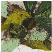 在她的另一幅油画新作《乐园2016,刺痛》中我们已经可以看到这种试图突破的苗头:与其惯用的繁复、铺满式构图不同,这幅作品背景为纯白的画布底色,有意借鉴国画计白当黑的空间处理方法。仙人掌的叶面有明显的笔触痕迹,叶子上的利刺也采用书写性的手法生发而出,画面局部还能看到宛若枝蔓蜷曲的构造,明显学习了传统写意花鸟画中藤蔓的处理手法,是以书法入画的典型方式。简单的一幅作品并不能说明艺术家在创作上经历了某种质的飞跃,更不能说她已经找到了一条蹊径,但这样的作品起码呈现了艺术家不断“蔓延”的创作状态。