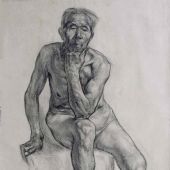 在《坐着的女人体》(98×80cm)这幅作品中,画家巧妙而又储蓄地安排了模特儿的动作,使之团身屈膝,中收外展,达到中国书法中般的间架严谨、舒张有度,通过疾徐变化的运笔,产生画面中的迥旋感。模特儿腿部的白布,笔触变化丰富,与人物面部的丰富色彩形成响应,成为两块明亮的受光区域。在这幅作品中,丁一林较好地处理了形体的平面组织与光影变化的关系,发挥了油画的“写意”特性,使作品具有了某种塞尚所说的博物馆作品的永恒意味。