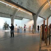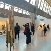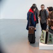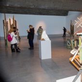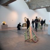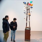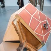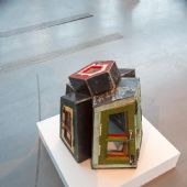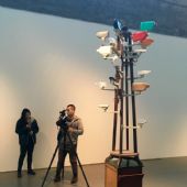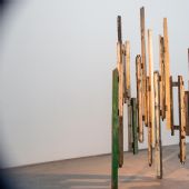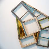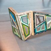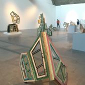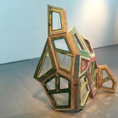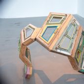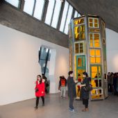 展览第一件作品是《坐井观天》,这是一件利用精致的废弃木窗户、金色塑料镜面组建的井状装置,作品内部四周皆为镜子,顶端五颜六色旧灯发出的光通过镜子不断进行反射,呈现一种视觉上的极度绚烂。“这是一个巨大的虚空,看到的繁华都是虚无,其实我们每个人在不同程度上都是井底之蛙”,宋冬这样解释这件作品。从观看体验来看,也就头顶的几盏旧灯是真实的存在,其他都是“反射的反射……”的虚幻,而我们却沉醉这种虚无的璀璨。展览主厅是21件《无为之为》和9件《无用之用》装置,其中《无为之为》将搜集来的旧窗框拼贴组建成各种审美物质形态,且极具抽象形式美感;《无用之用》则是由碎裂的旧家具加上旧瓷砖、旧水管等废弃物拼贴而成,从而在这些生活之物的本来价值之外探索新的价值存在。对于这种“废物回收”的创作方式,宋冬是这样理解的:“我们会扔弃生活中的各种废弃物,我们放弃它就是放弃它原本的所有价值,我就想这其中是不是有我们不应该放弃的东西,我得找回来,这到底是生活还是艺术?这两者是混杂的,生活就是艺术,艺术就是生活。”展览的另一组作品《草图》同样是宋冬“捡”回来的,他将别人的瓷片边角料根据个人审美挑选、打磨、标注、上釉、烧制成形,“草图”也就是尚未成形的,是可变的,有着无限的可能性,其实生活也是一幅草图,我们一直想得到一件成品,一直在这个过程中。