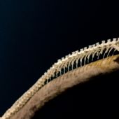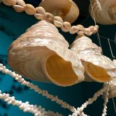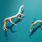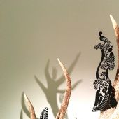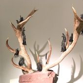 作品《大骨架》在展览现场极为醒目,一具类人猿骨架在聚光灯下具有明显的寓言故事色彩,近观才能发现是由各种类型的抛光海螺组成,且核心位置的海螺用金色马克笔描绘人脸、动物、怪兽等形象,仿佛标记着海螺不同的身份和性格。这些海螺作为骨架的构成单元存在时,这些图像没有任何实际意义,只有近距离的观察才会发现其中存在的差异。此外,装置作品《恐龙》也是自然实物的异构组成并形成独特的寓意解读,蛇骨贴合于马鹿的鹿角上,鹿角似乎为蛇爬行的树枝,蛇骨又好似是鹿角上的茸毛,这种属性的异化和误读让个体和整体都发生了本质性的改变。