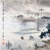 宗先生离开窗户,站到画案前,铺上一小张宣纸,仍未说话。但我从先生眼中的光芒看出来,他情绪激动。我连忙站到画案边——水盂和砚台都是现成的。我知道先生的习惯,这是千万不要出声,只管安静地站在一旁看就是。果然,先生提笔,刷刷几下勾出饭店门口传达室,接着手腕一抖,只听笔头在宣纸上刷刷有声,门前的树就被疾风吹弯了腰,树下一个人身不由己顶风抗争着,十分吃力;空中的几片飘叶,桥上的隐约人物……疾风乍起,暴雨将至的瞬间,就这样以疾风暴雨式的笔法顷刻而成。说什么一挥而就、神定气足,就在这一刻无比充分、无比生动地展现于眼前。先生把笔一丢,转身离去,只剩我木呆呆立在那里。如果对面有镜子,会照见我满脸的惊愕与钦佩!借着这场雨,宗先生如此即时印证了关于观察与默记,概括与表现的论述。让我明白这就是速写!这就是创作!这就是厚积而薄发!这就是一个艺术家对生活对大自然的激情!我得亲见这难得的一幕,我是有福的。