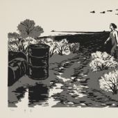我在构思《不眠的大地》一画时,想到1955年曾经亲历烧荒开荒的场面,前期准备,先要圈出范围,周边打好防火道,众人分段把守,统一指挥,那百里火龙,惊飞的鸟群,各种声音回荡在烟火弥漫的天空中,拖拉机翻开黑油油的土地,蔚然壮观,历历在目。这幅作品的设计,正是以烧荒开荒为背景,被惊醒的大雁放在画面的主体位置,虽然躯体沉重,还是毅然起飞了,我以为这样的视觉效果,符合万物复苏百废俱兴的意蕴。人们通常把东北七称为“白山黑水”。我初次到小兴安岭,看见河水像酱油颜色,经了解才知道那是从森林渗出的腐殖质,是树叶、草籽沤出来的肥水。在处理《白山黑水》画时,山的形状是以雪树组成的。河水封冻之前尚有余温几只飞鸟本能地掠过水面,这种自然情趣和地域特色的整合,是为了再现人们心目中的白山黑水。《疾风劲柳》的画面以阴刻为主,背景的树以黑色衬托,厚重而深邃,还有那清晰与不清晰的线,组成了富有动感的结构线。《昨夜风雨》是从室内看盛开的梅花,透过玻璃看窗外的雨水,风雨和梅花的错位组合,有望扩大想象的空间。